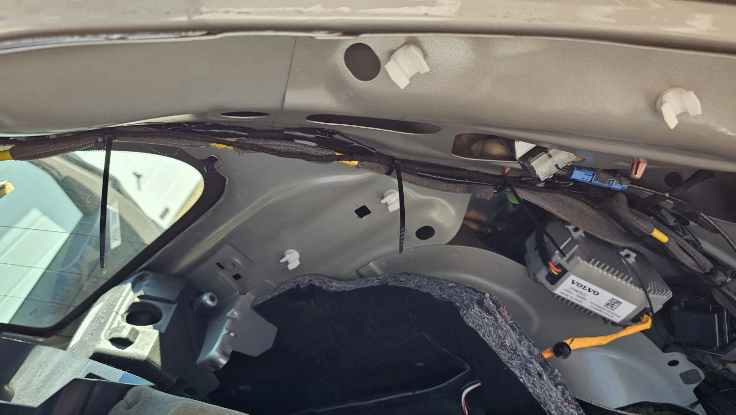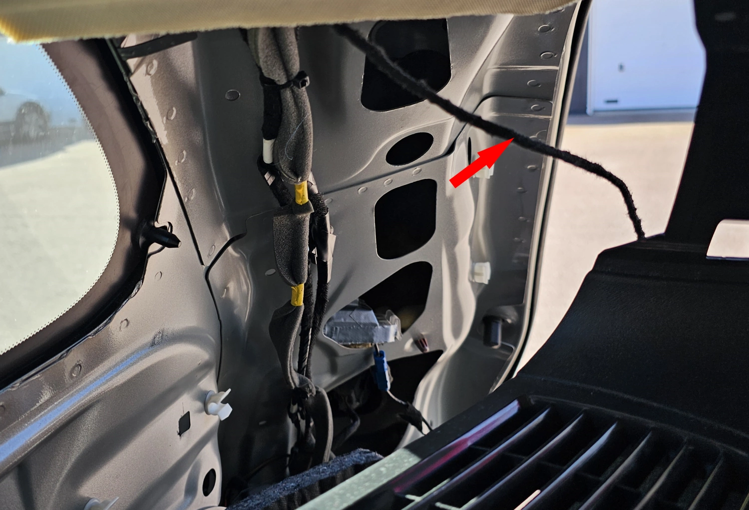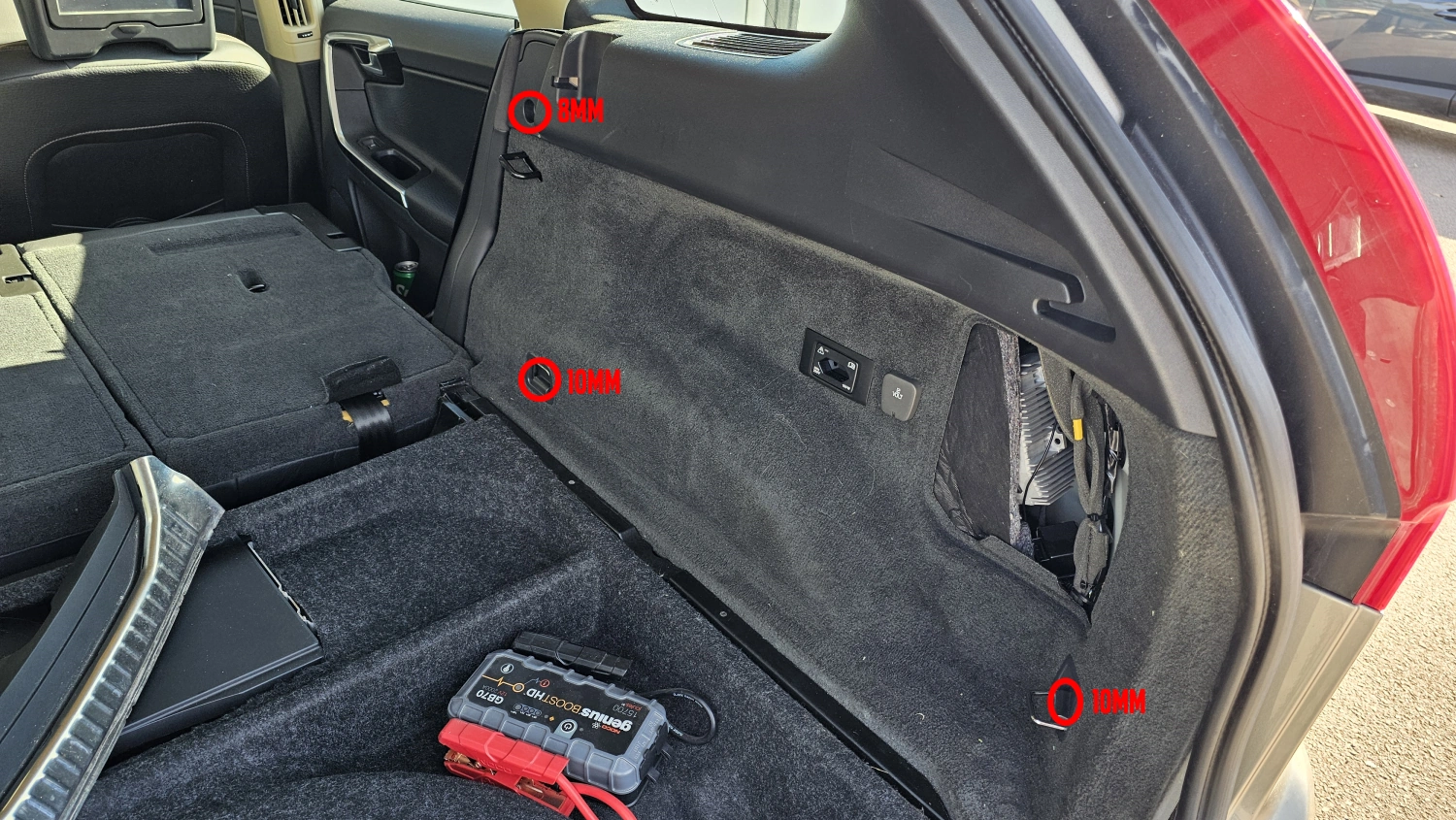 HBS sensorn ska monteras i golvet under höger bakstycke. Här måste inredningen demonteras för att komma åt stället där sensorn ska sitta. Det sitter 2 st 10mm, plus en 8 mm i hörnet vid bältesrullen. I taket sitter det ett stor plast list som måste tas bort, sen kan man ta bort inredningen på sidan och komma åt innannätet.
