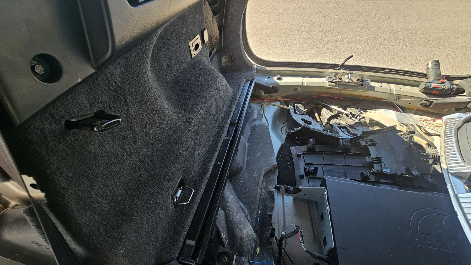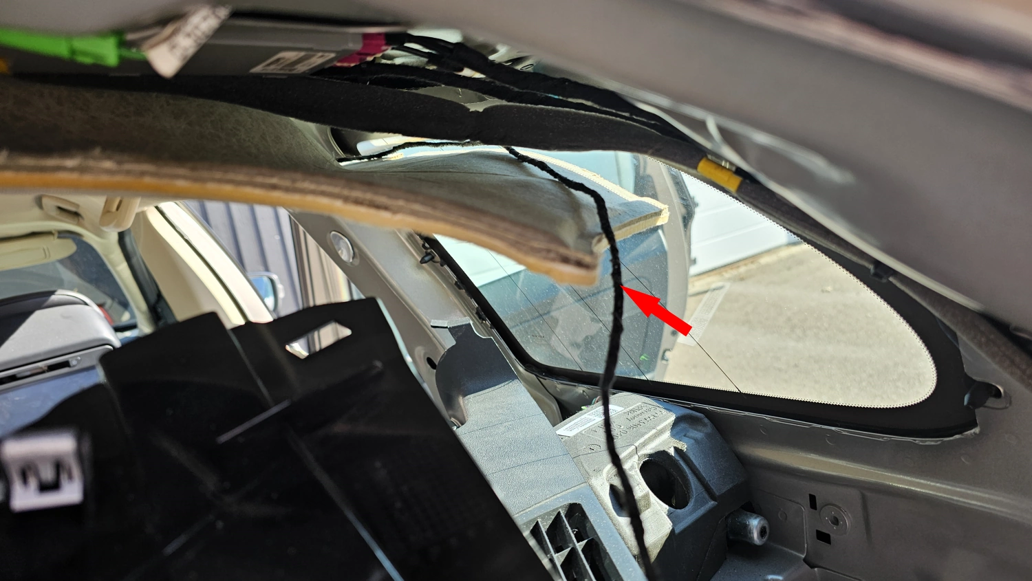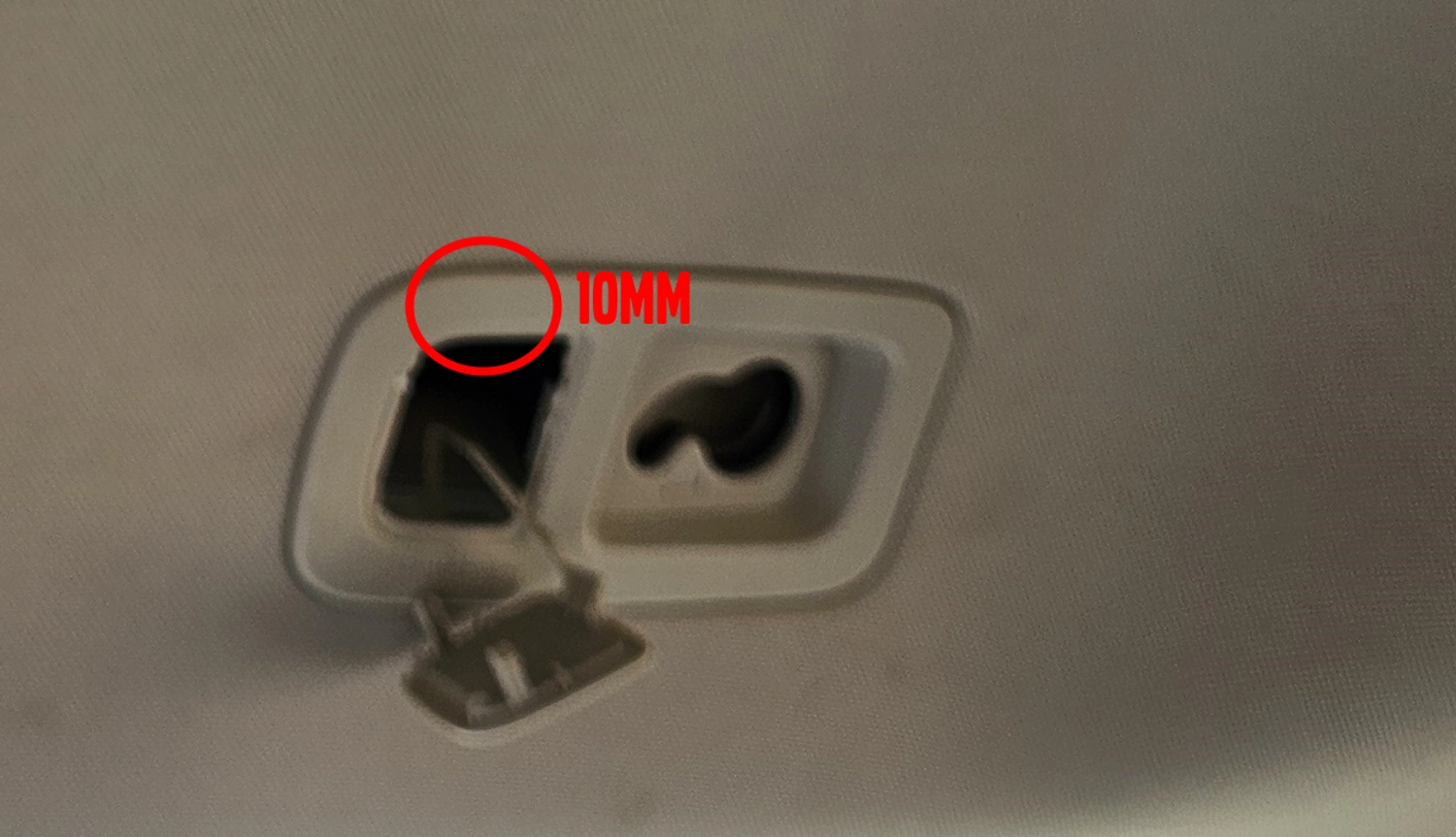 HBS sensorn ska monteras i golvet under höger bakstycke. Här måste inredningen demonteras för att komma åt stället där sensorn ska sitta. Det sitter 2 st 10mm, plus en 8 mm i hörnet vid bältesrullen. I taket sitter det ett stor plast list som måste tas bort, sen kan man ta bort inredningen på sidan och komma åt innannätet.