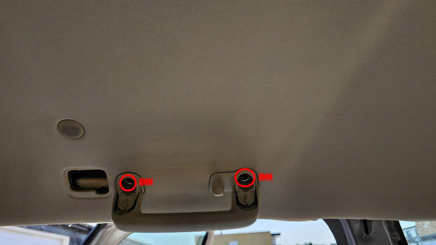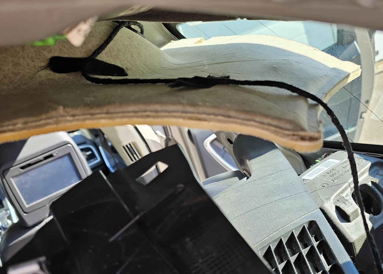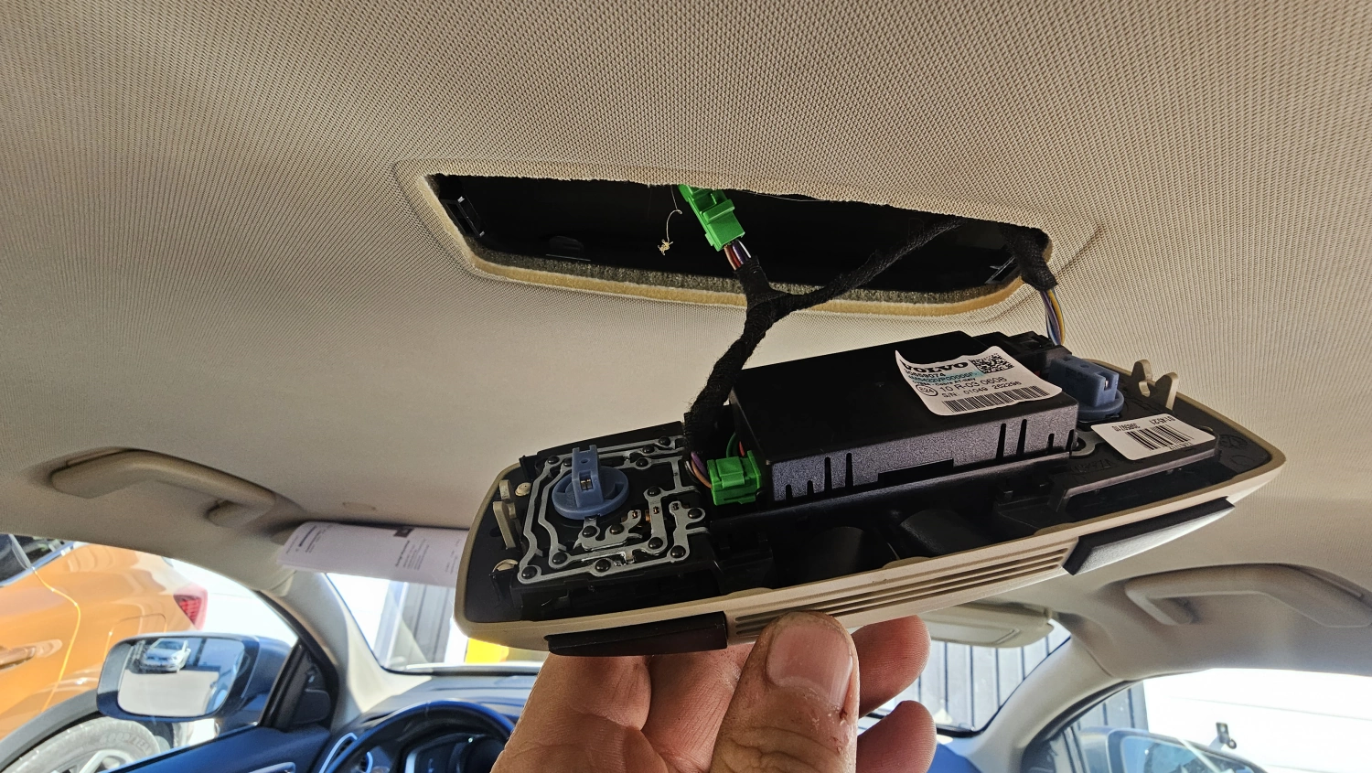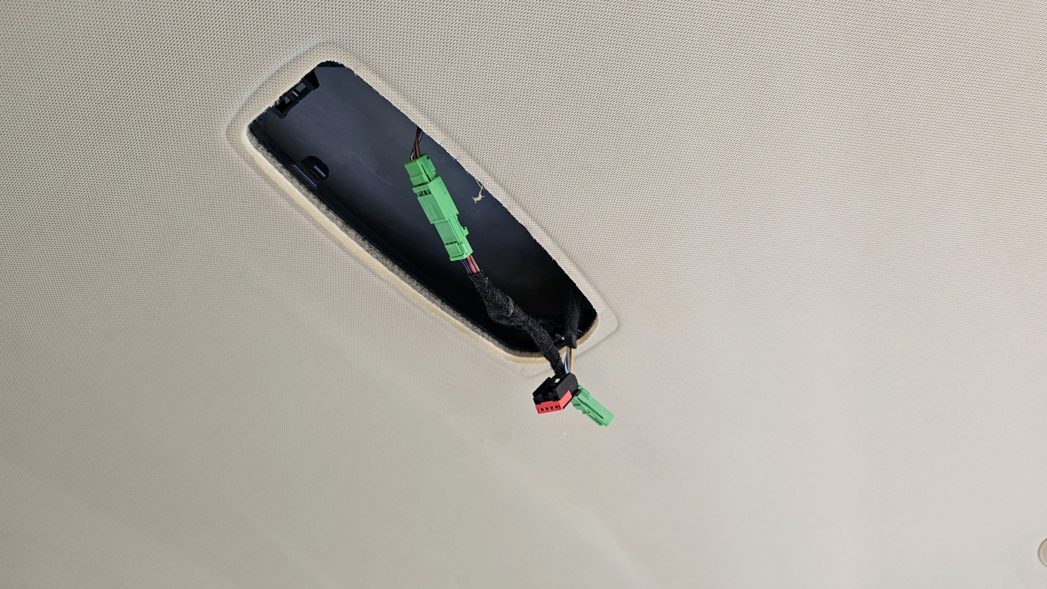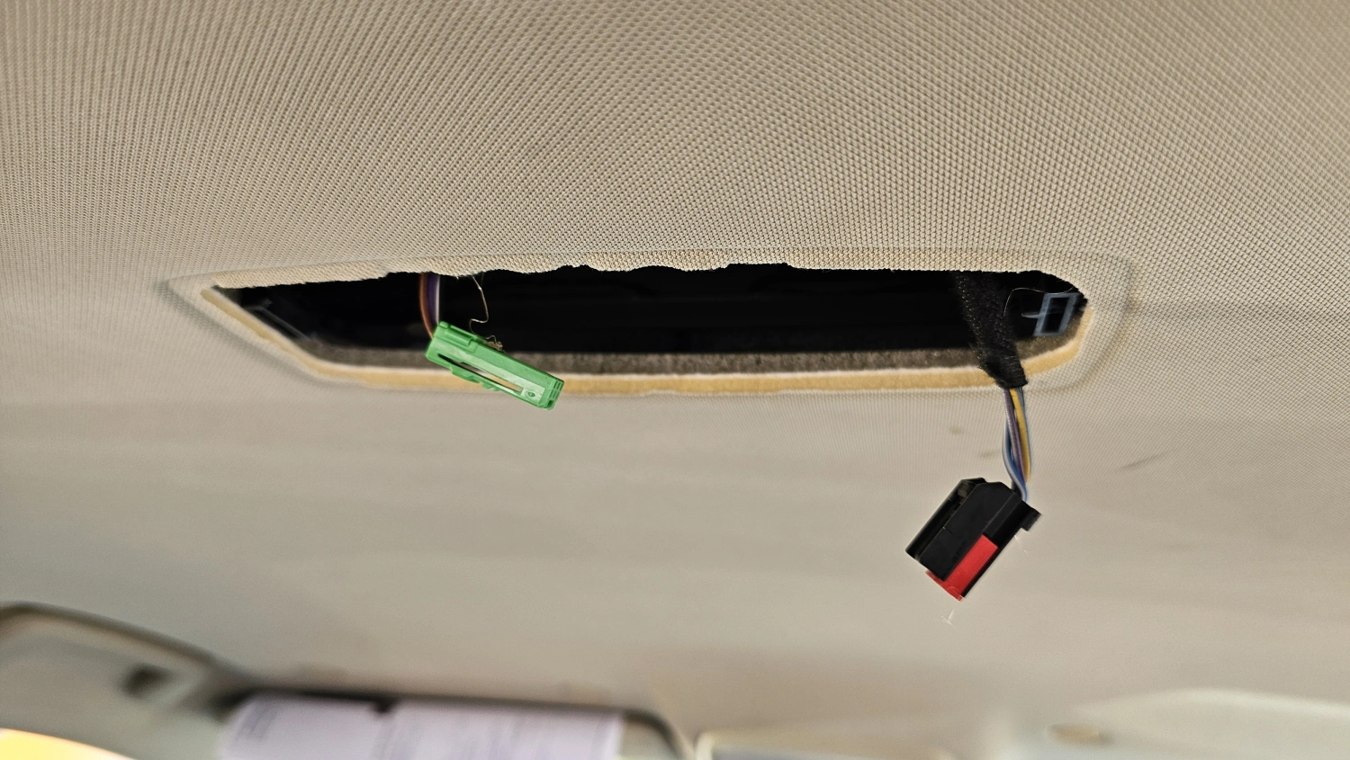 Sen tar jag bort armaturen i taket och hakar av IMS sensorns kabel och sedan föra in kabeln genom hålet och drar den bakåt, men först måste taket lossas. I handtaget sitter skruvar som måst avlägsnas samt en skruv för näthållaren. Böj ned taket lite försiktigt så drar vi kabeln längst taket .På vägen tejpar vi kabeln i innertaket för att förhindra att den ligger och skallrar.
