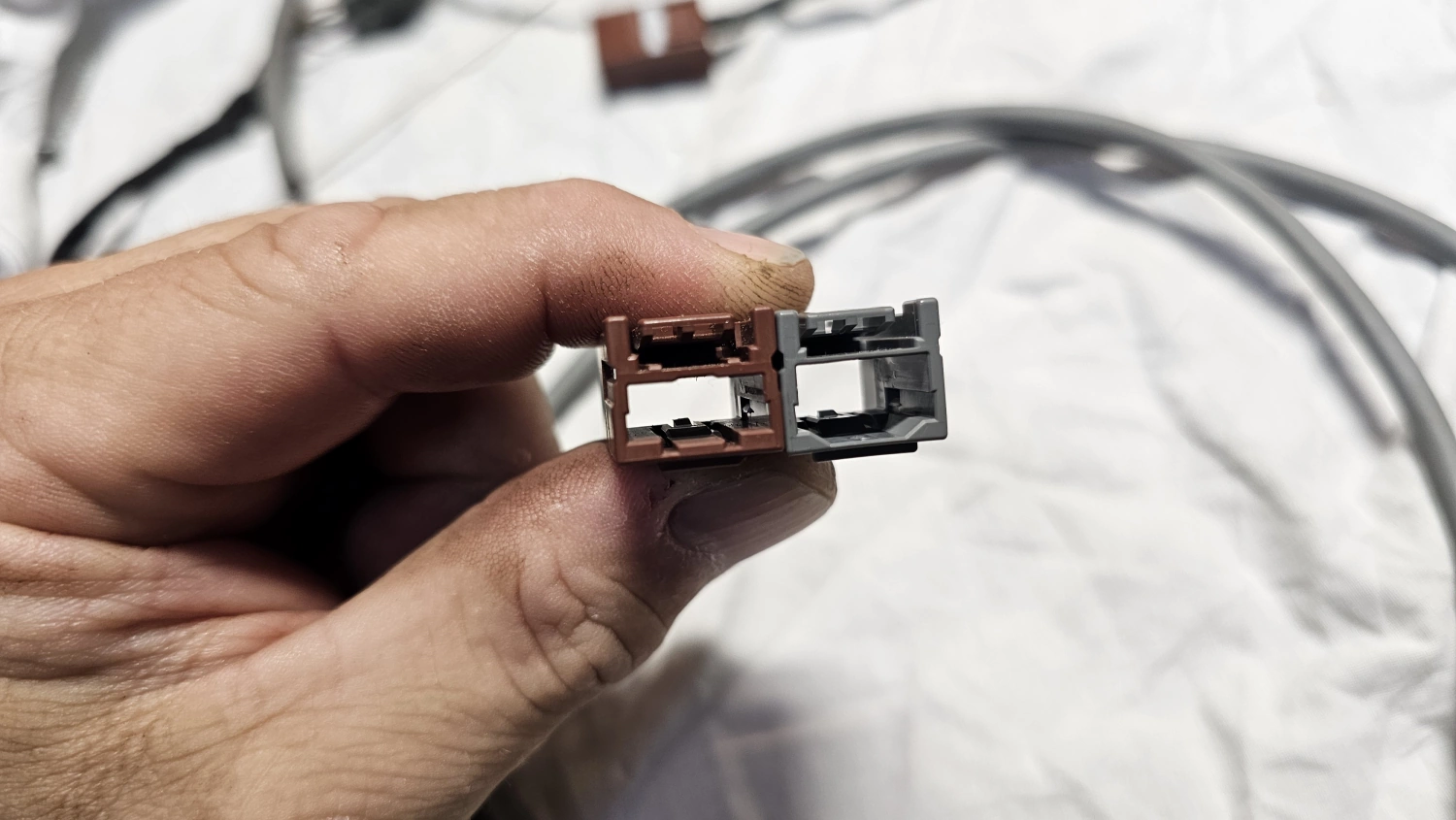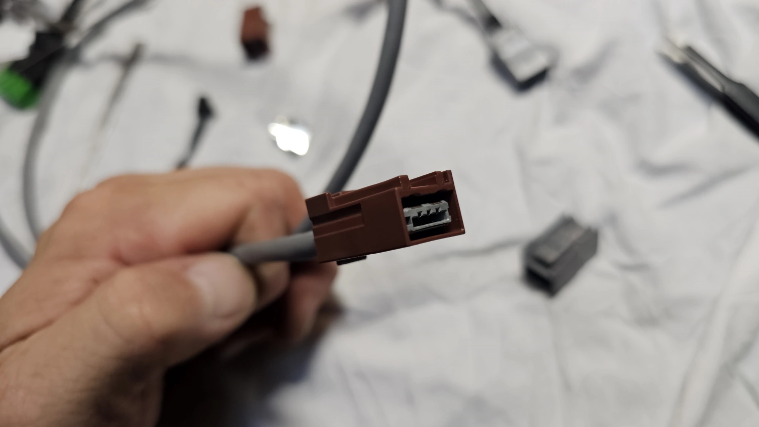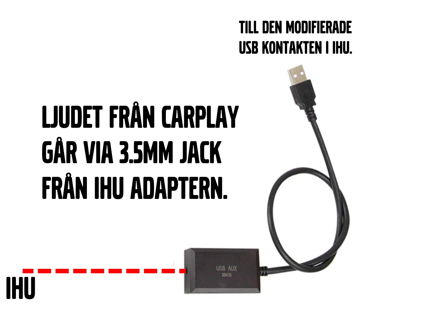 Enligt min bild skriver jag att man inte behöver universal kablaget. Det är en sanning med modifikation. Men vill du ha en USB till själva Carplay:en så måste du ansluta Universalkablaget. Det är så att Carplay:en dirigerar om ljudet igenom 3.5 mm kontakten ned till en liten AUX box som måste anslutas till USB uttaget i IHU. Problemet som jag ser då blir att USB uttaget i IHU blir upptaget av denna adapter. Vilket blir lite mögigt om du vill använda USB uttaget till annat som att uppdatera kartor eller IHU i sig. Om inte adaptern sitter i USB:n så tystnar musiken som Tomas Ledin skulle ha sagt. Hur fan löser man det då? Jo jag offrar helt enkelt VOC modulen. Alltså jag använder VOC endast till att starta bränslevärmaren och det kan jag göra med min T100HTM fjärrstart. Sen så håller jag faktiskt på att sortera ut ID för detta i en kommande multifjärrstart/lås och lås upp modul. Så VOC:en får stryka på foten så jag kan använda den bruna USB:n i IHU, så USB uttaget i tunnelfacket blir över till annat. Då behöver vi tillverka en USB kabel från den bruna till en grå USB. Detta är väldigt enkelt. man tar bort den bruna hylsisolatorn från USB kablaget till VOC och monterar den på en ”vanlig” Volvo USB kabel. Varför man på Volvo särar på USB 1 och USB 2 fattar jag inte riktigt. Men det kan ha att göra med andra bilmärken(Mercedes,Landrover och Lexus bl.a) dedikerar en USB kanal till kringutrustning. Nä väl, tillverking av USB kabel görs genom att använda en extra grå Volvo USB kabel där man tar bort dess hylsisolator.