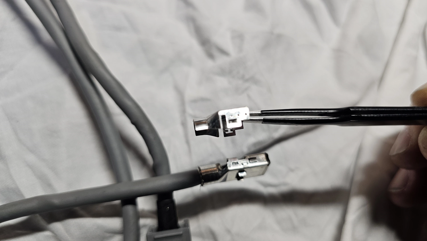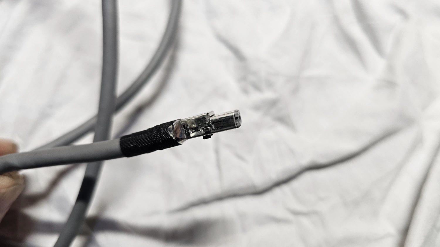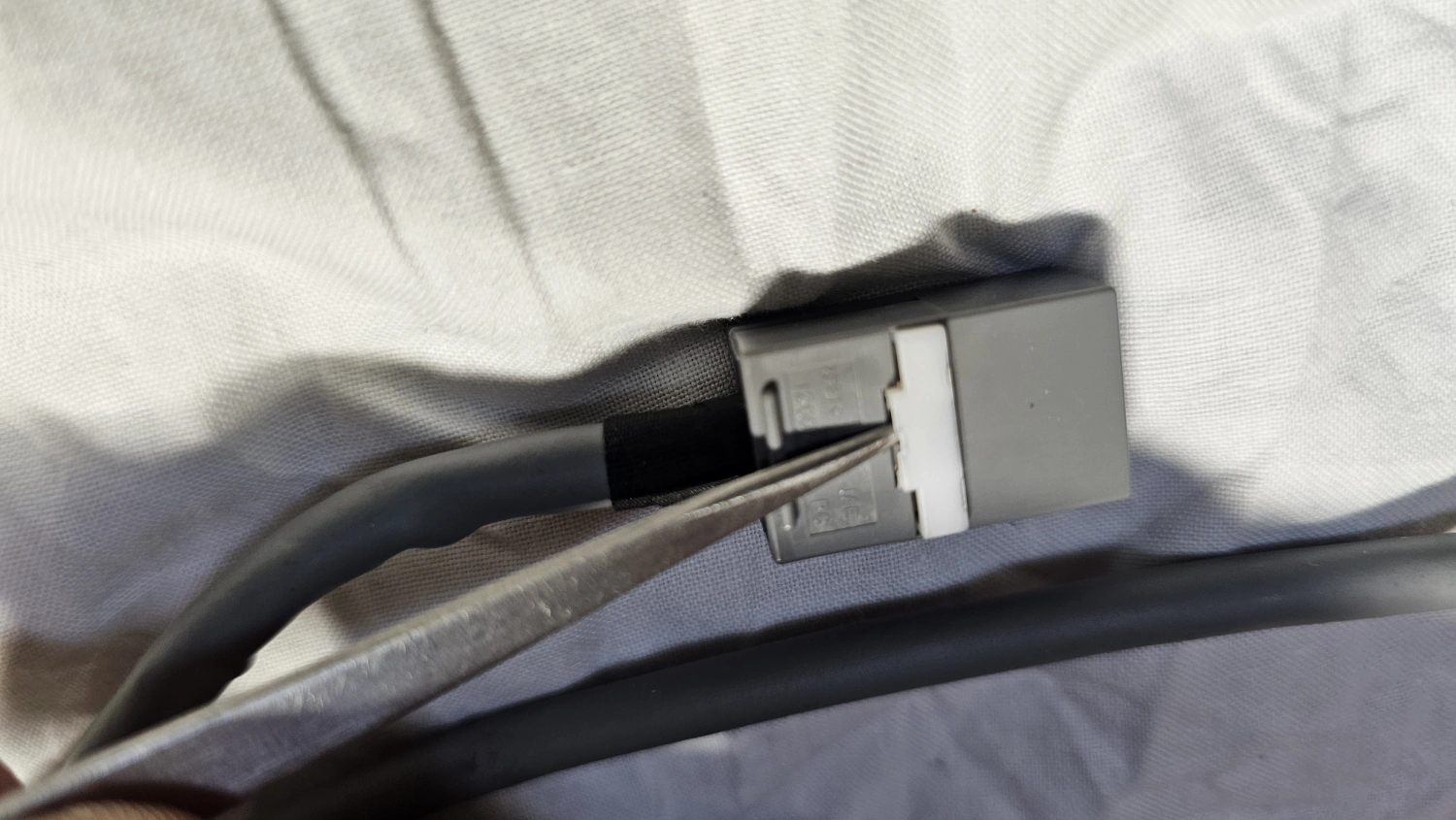 Eftersom en bruna hylsisolatorn har en annan mindre fåra så måste kabeln modifieras och det gör lätt genom att det överstickande höljet tas bort. Det verkar här som att man ändå tänkt från tillverkarens sida att man kan montera USB kabeln i vilken isolator som helst, konstigt nog. Tar man bort tejpen och tar bort plåtbiten på kabeln med en tång så är det inge problem längre, kabeln är bara tycka in igen i den bruna hylsisolatorn.