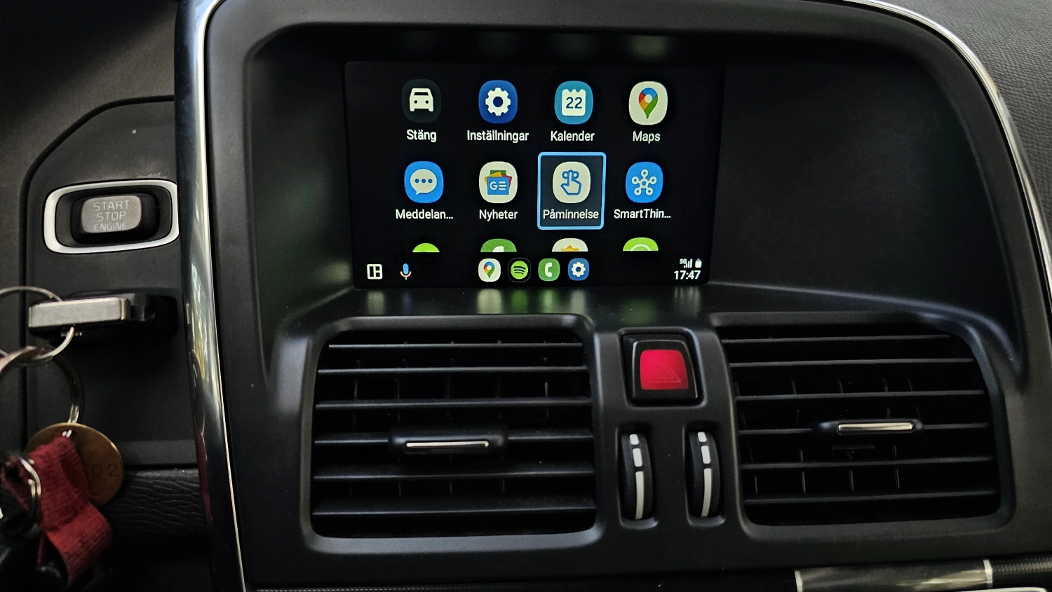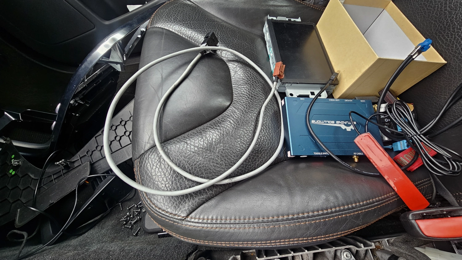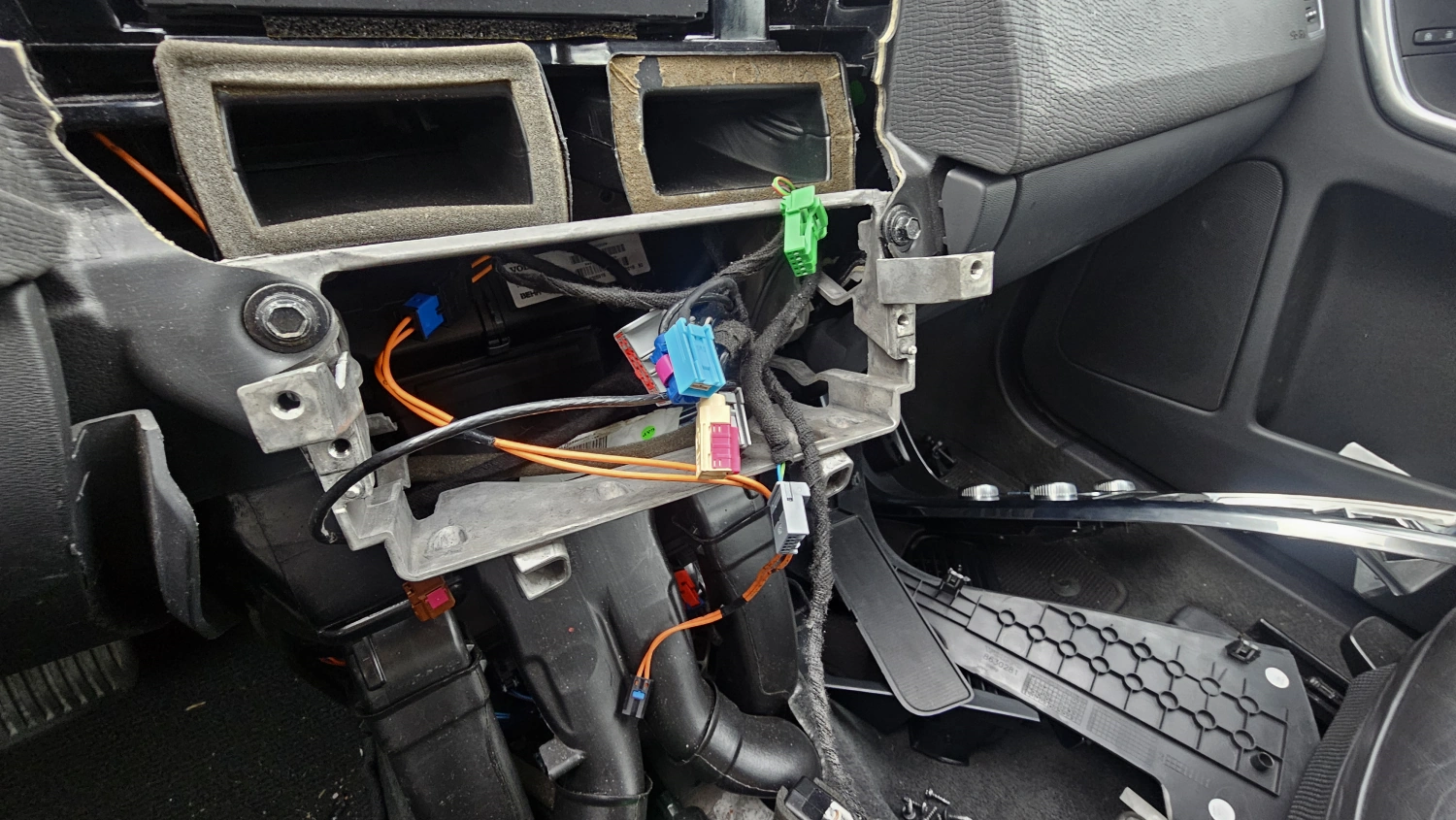 När USB kabeln och adaptern nu är klara så börjar vi på montering i bilen. Det sker genom att plocka bort mittkonsolen och demontera handskfacket, plocka ur skärm och IHU så vi kommer åt dess kontakter som vi kommer leka med. Enklast är att börja med vart du ska placera Carplay:en. Jag hittar en bra plats i XC60 precis bredvid handskfacket på högersidan mot mittkonsolen.