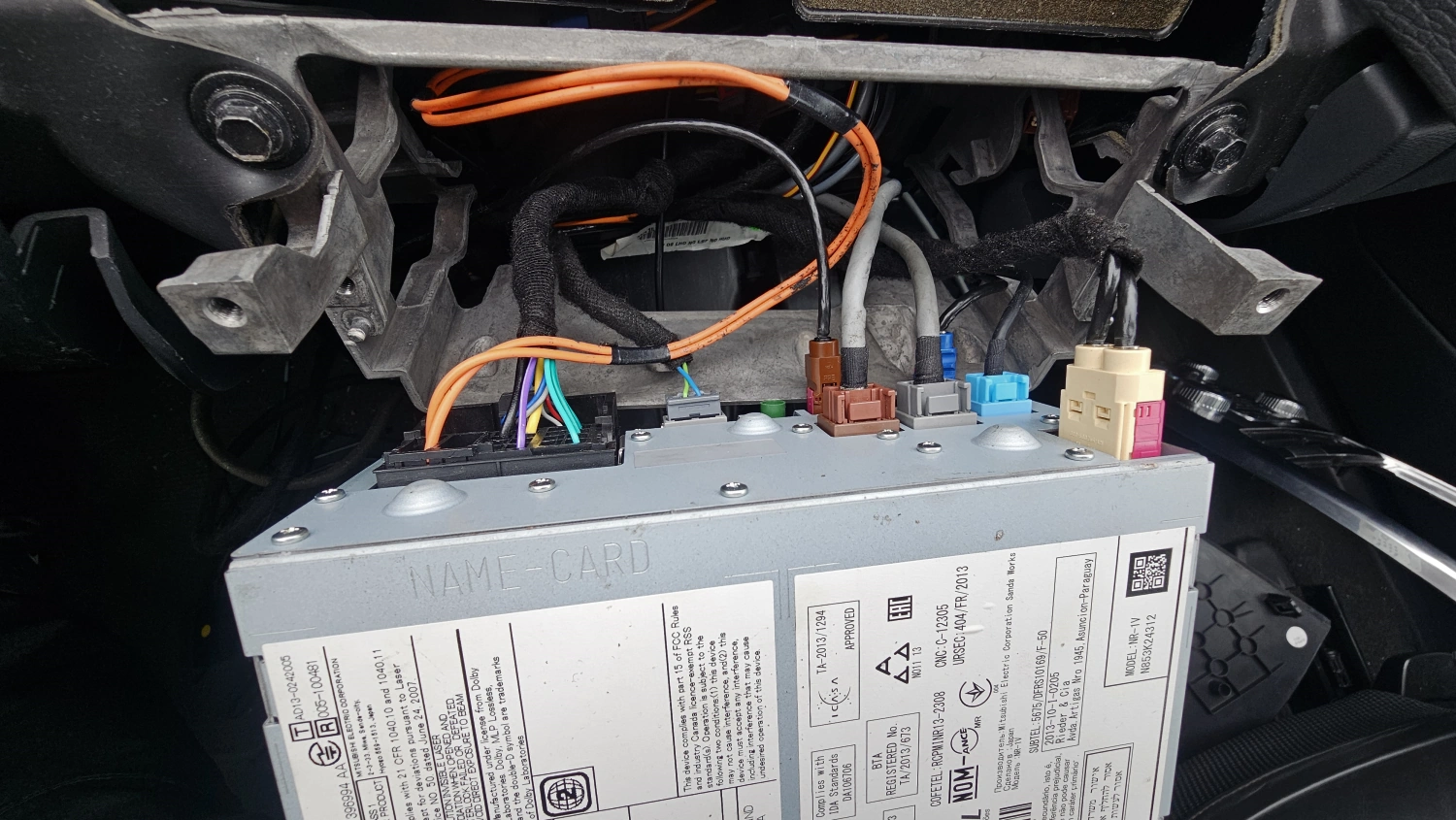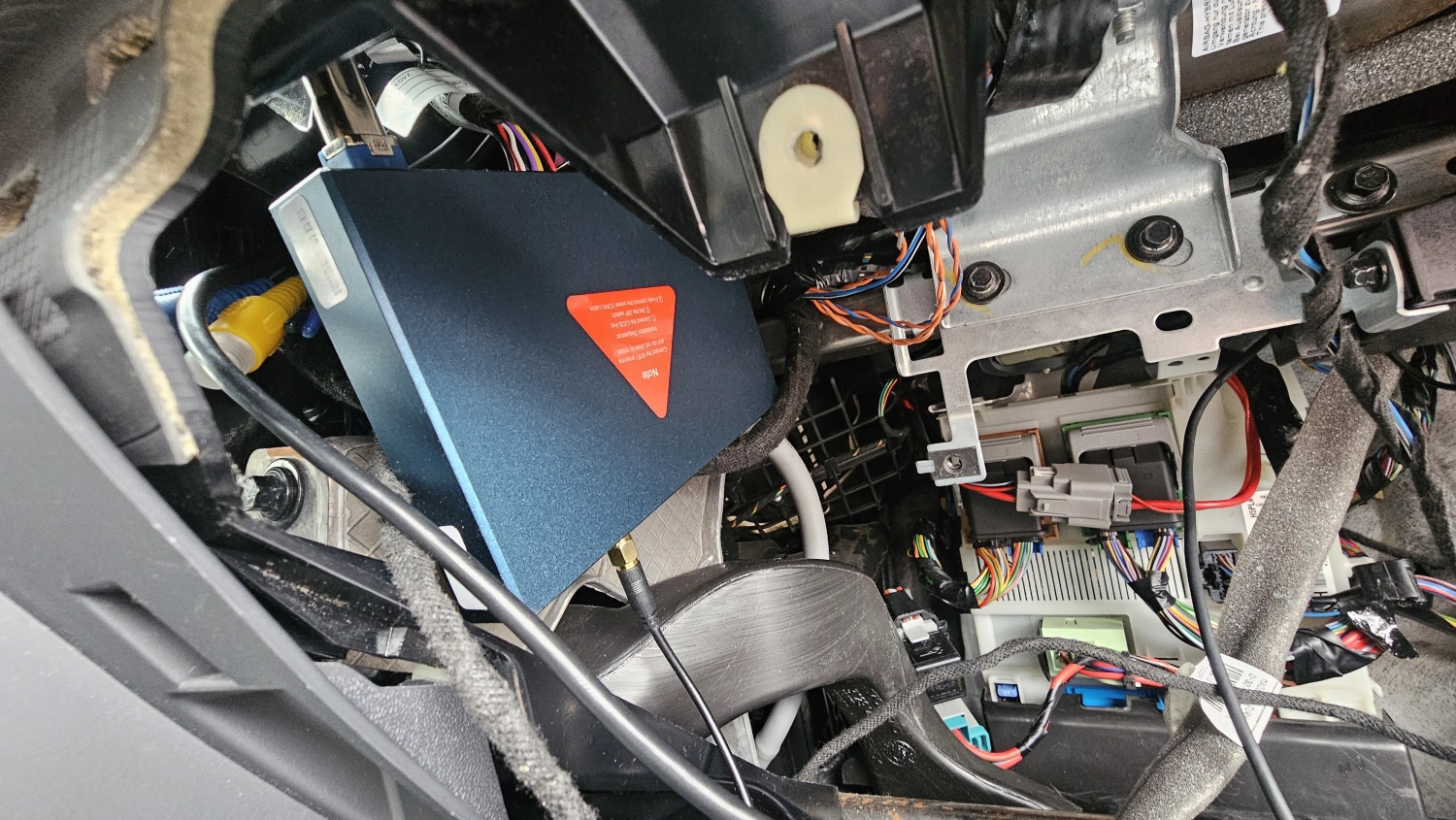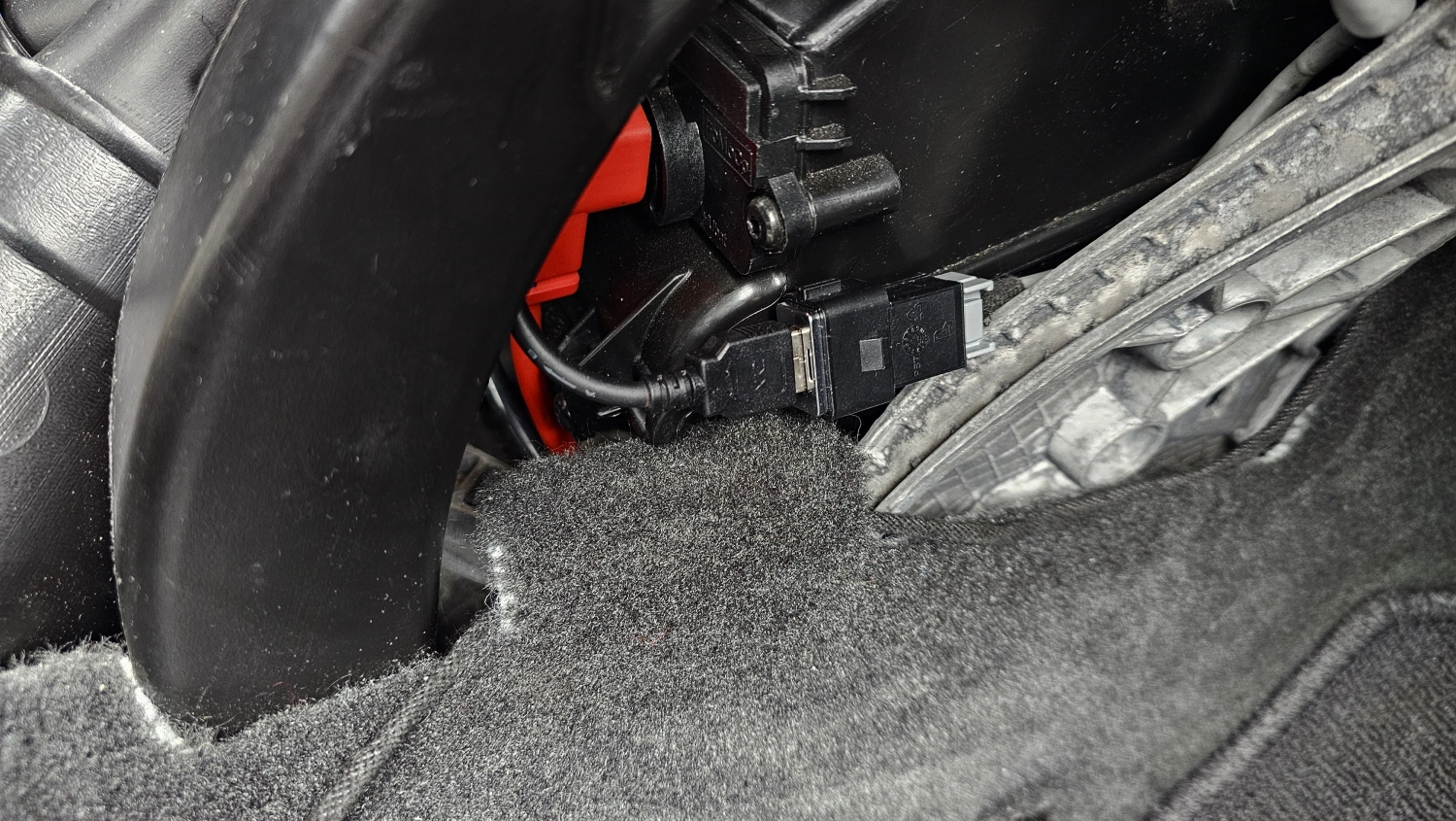 Den modifiierade IHU adaptern plockas fram och den passar precis som jag tänkt. Den blev lagom lång så den räcker att stuva undan på vänster sida om mittkonsolen. även dags att plocka bort VOC:s gamla USB och dra en ny USB från IHU ned till en lämplig plats som jag hittade vid utloppsröret till luft/värme systemet. Då kommer jag även åt den USB kopplingen enkelt om det skulle bli något knas med Carplay:en. GPS antennen till Carplay tejpar jag fast ovanför kanten där man skruvar fast handskfacket.